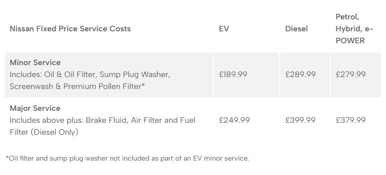 Minor servicing includes oil, oil filter, sump plug washer, screen -wash, premium pollen filter only. Major servicing includes oil, oil filter, sump plug washer, screen -wash, premium pollen filter, brake fluid, air filter, fuel filter (diesel only) only. Oil, oil filter and sump plug washer are not included as part of an EV minor service. Servicing must be completed by a Nissan Dealer at the length/miles intervals specified by Nissan. Servicing must be completed by a franchised Nissan Dealer at the intervals specified by Nissan. Nissan reserves the right to amend or withdraw this offer at anytime without notice.